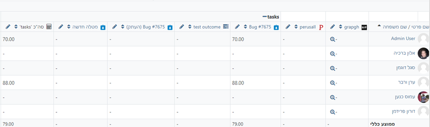 כדי לצפות בציונים של סטודנט מסויים ניתן ללחוץ על אייקון הטבלה מול הסטודנט הנבחר