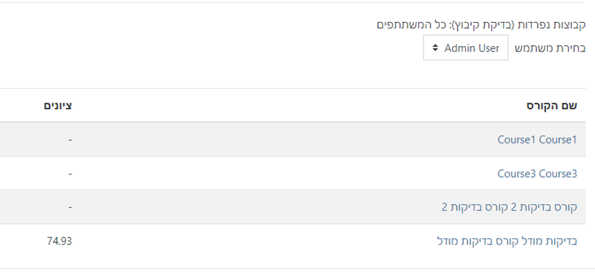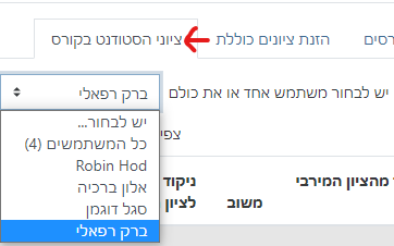 כמו כן ניתן ללחות על לשונית תצוגת ציוני הסטודנט בקורס, ולבחור את המשתמש הרצוי מתפריט "יש לבחור משתמש".