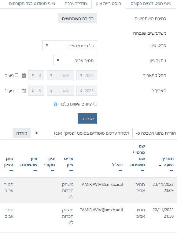 היסטורית ציון: לשונית זו מאפשרת לאתר ציון מסויים – על פי פעילות, סטודנט, נותן הציון, תאריך נתינת הציון, רק ציונים ששונו.