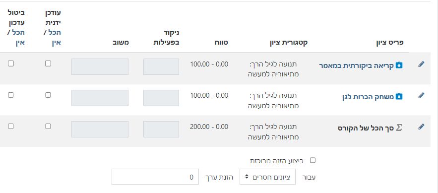 ניתן להזין ציונים לפעילות ספציפית על ידי בחירת כלי העט שמול הפעילות