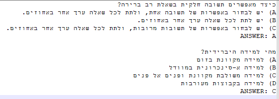 • העברת השאלות למודל מ-Word היא למעשה קוד האומר למודל כיצד להציג את השאלות. אם לא תהיה הקפדה על הכללים, או אם הקובץ ייובא בפורמט לא נכון השאלות לא יהיו ניתנות לשימוש.