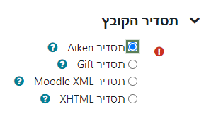 • פורמט AIken הוא הפורמט הקריא ביותר, ולכן גם הפורמט המומלץ. החסרון של פורמט זה - ניתן להעביר בו רק שאלות ברירה או שאלות כן לא. במידה ורוצים להשתמש בפורמטים אחרים יש להבין את המבנה שלהם. Moodle XML, GIFT.