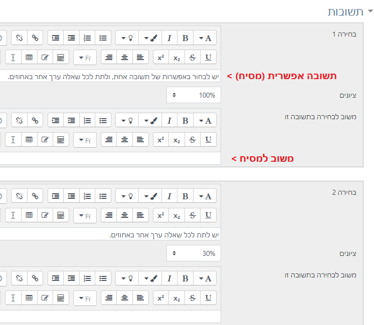 - מספר תשובות נכונות: ניתן לבחור במספר מסיחים. כאשר בוחרים בכל המסיחים הנכונים מקבלים 100 אחוז מהניקוד על השאלה. עם תלמיד בוחר בחלק מהמסיחים הנכונים הוא מקבל ניקוד חלקי על השאלה. גם כאן ניתן ליצור שלילי לחלק מהמסיחים.